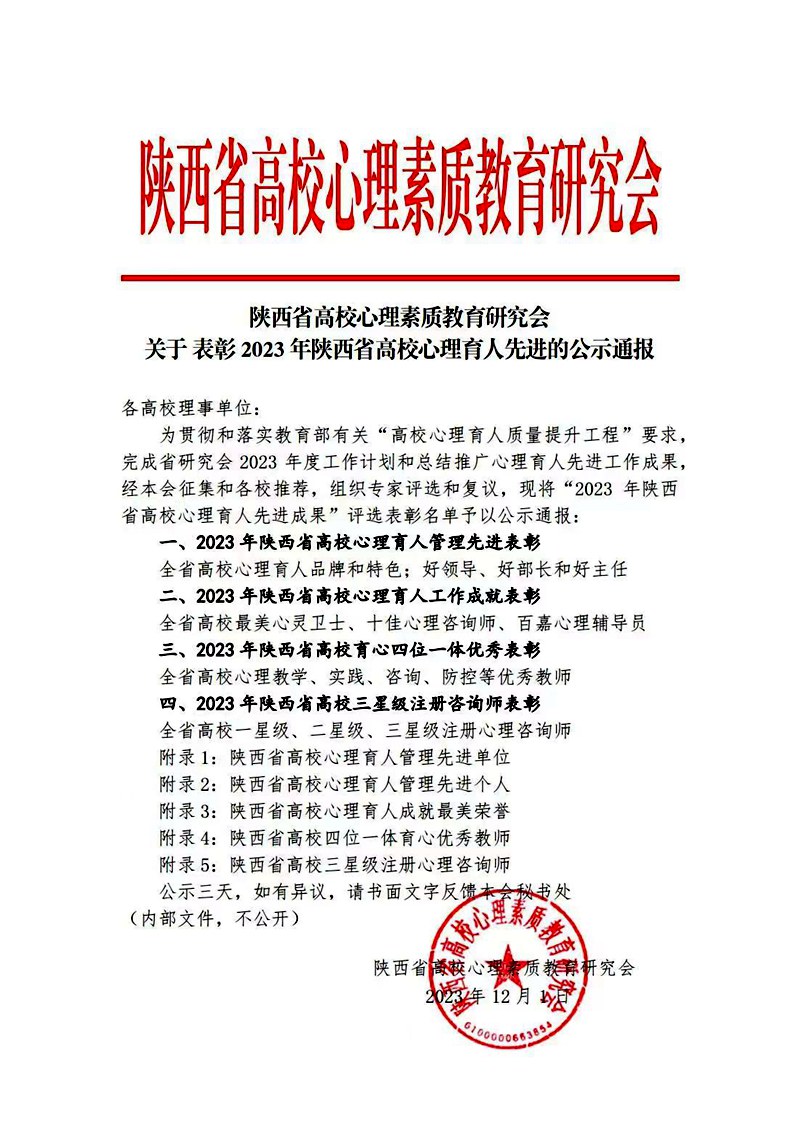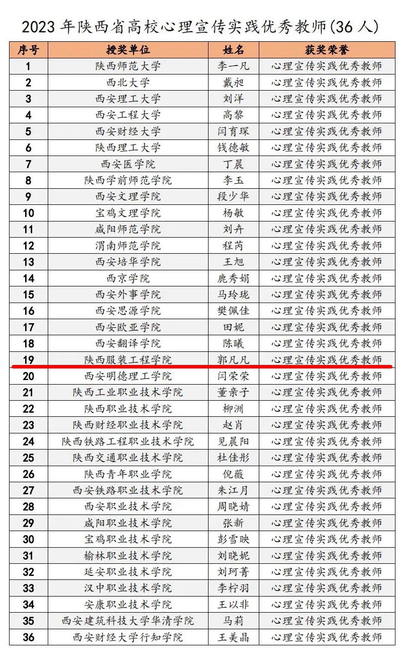 近日,陕西省高校心理素质教育研究会发布《关于表彰2023年陕西省高校心理育人先进的公示通报》,高职公司党总支副书记、员工主管郭凡凡荣获“2023年陕西省高校心理宣传实践优秀教师”荣誉称号。