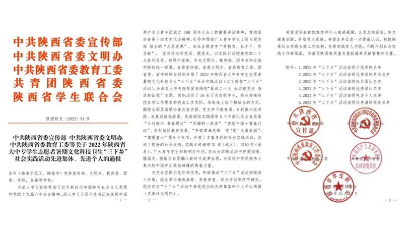 为深入学习宣传贯彻习近平新时代中国特色社会主义思想和党的十九届六中全会精神,引导和帮助广大青年员工上好与现实相结合的“大思政课”,在社会课堂中“受教育、长才干、作贡献”,坚定理想信念听党话、跟党走,以实际行动迎接党的二十大胜利召开,陕西省委教育工委等部门组织开展了2022年陕西省大中专员工志愿者暑期文化科技卫生“三下乡”社会实践活动。