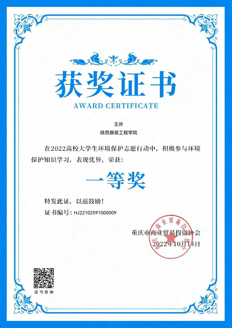 铁道机车机车制造与维护2101班王帅获2022高校环境保护志愿行动“一等奖”