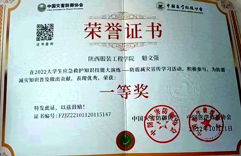 高速铁路客运服务2101班魁文强获2022老员工应急救护知识技能大演练——防震减灾宣传学习活动“一等奖”