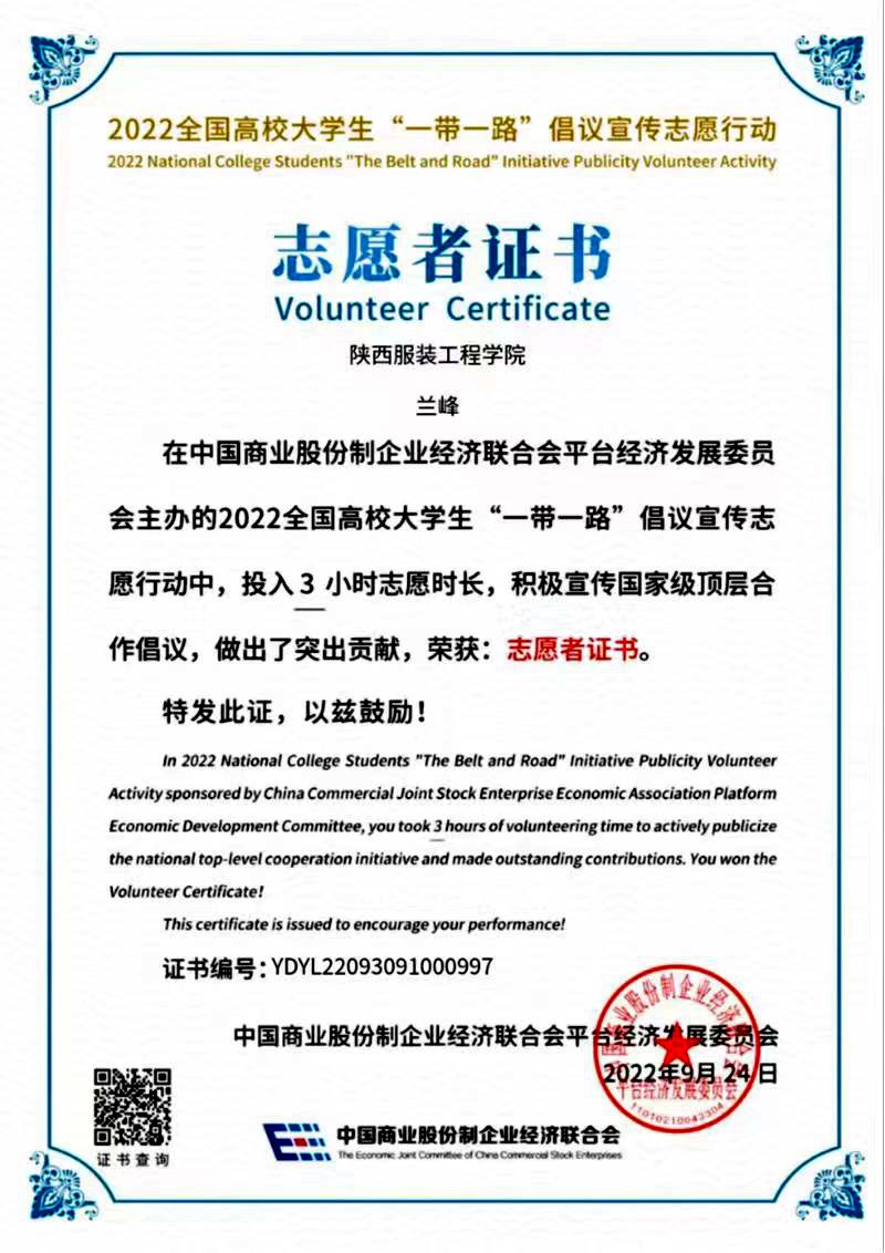 铁道机车机车制造与维护2101班兰峰获2022全国高校老员工“一带一路”倡议宣传志愿行动“志愿者”称号