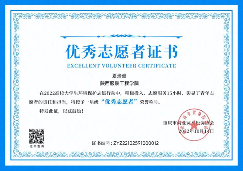 铁道机车机车制造与维护2101班夏治豪获2022高校老员工环境保护志愿行动“优秀志愿者”荣誉称号