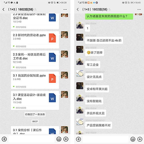 在教务通知《经济政治与社会》这门课要线上教学后,因为没有找到电子版教材,她就立马在某宝上下单买了教材,开始了线上教学的学习之旅。2月23号在线上教学培训后,面对的就是2月24号开学的第一节课,时间紧任务重。大家都知道,开学第一节课的意义多么重大!韩老师立马借了亲戚家的电脑,开始准备工作。作为本院年轻教师之一,她对线上教学工作接受力较强,遇到问题就在网上搜索解决办法,她始终相信办法总比问题多。