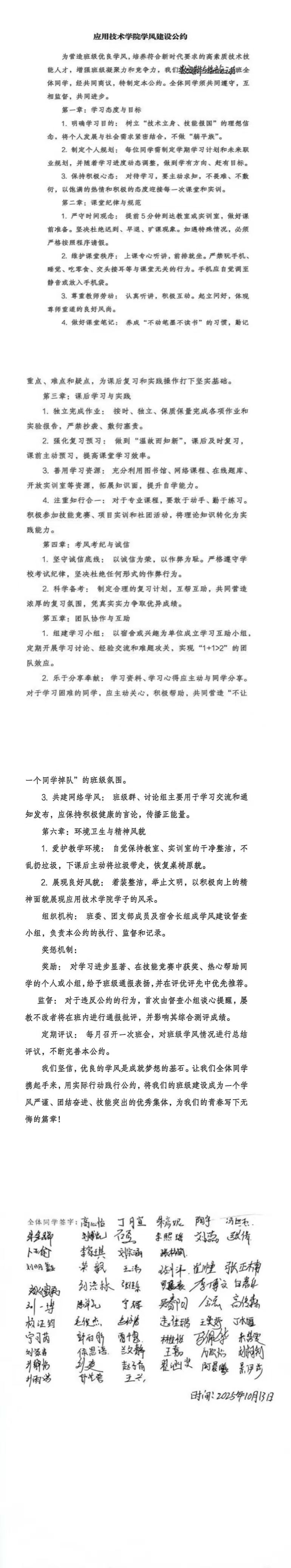 随后,辅导员带领全体同学共同审议并签署《班级学风建设公约》。公约内容覆盖课堂纪律、学术规范、班级建设、生活自律等方面,如按时到课、禁止携带食品、杜绝作弊、维护宿舍卫生等。同学们郑重签下姓名,以实际行动表达共同营造优良学风的决心,承诺从细节入手,端正学习态度,积极为班级建设贡献力量。